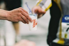 Trinken ist Pflicht. Der Magen kann in ca. 30 Minuten 0,3 bis 0,4 l Flüssigkeit in den Körper pumpen, d. h. es ist besser über den Tag verteilt mehrfach kleine Portionen zu trinken. Bis kurz vor dem Start kann „schlückchenweise“ hydriert werden. Während des Wettkampfes bitte jede Wasserstelle nutzen und 1 bis 2 kleine Becher (insgesamt 0.2 – 0,4 l) trinken.